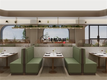 今天分享的是銀川預海餐廳設計裝修效果圖。設計師首先要與甲方客戶確定好餐廳改造的設計風格和主題,基于當地的文化、歷史、自然景觀與特定的概念。風格與餐主題的一致性能夠增強餐廳的品牌形象力和吸引力。主案設計師根據客戶的設計裝修需求,為其打造出的餐廳設計裝修方案。本餐廳設計融合了古樸韻味與現代簡約美學,通過棕色、原木色、綠色主色與天然材質的交織,打造出一處具有人文溫度與自然靈性的沉浸式用餐空間。從深咖原木到淺駝墻面,層層遞進的棕色奠定沉穩基調,綠色的皮質沙發又很清新脫俗,整體給食客的觀感很好。